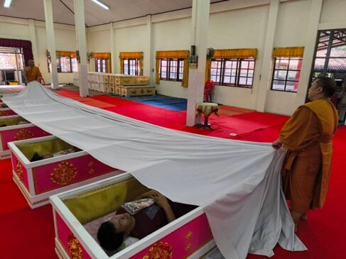 นครนายก – นักท่องเที่ยวเข้าพิธีนอนโลงศพแก้ปีชง เสริมดวงชะตาชีวิตวัดหลวงพ่อปากแดงจังหวัดนครนายก