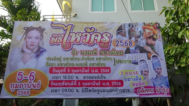 เมื่อเวลา 08.00 น.ของวันนี้ (6 กพ.68) ที่บ้านเลขที่ 86 หมู่ 12 ตำบล แสวงหา อำเภอแสวงหา จังหวัดอ่างทอง ซื่งเป็นบ้านเกิดของ “จ๊ะ นงผณี มหาดไทย” นักร้องนักแสดงชื่อดัง จัดพิธีไหว้ครู โดยมีดารา นักร้อง ร่วมงานเป็นจำนวนมาก