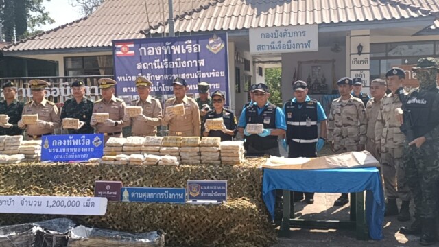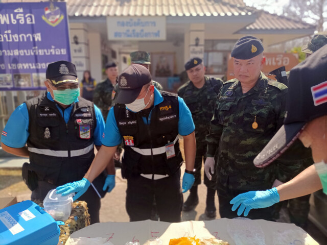 บ้านพันลำ ต.วิศิษฐ์ อ.เมืองบึงกาฬ จ.บึงกาฬ พล.ร.ต.ณรงณ์ เอมดี ผบ.นรข.น.อ.วิศิษฐ์พงศ์ เจริญวิชยเดช ผบ.นรข.เขตหนองคาย พ.อ.ปราโมทย์ เนียมสำเภา รอง ผบ.กกล.สุรศักดิ์มนตรี พ.ต.อ.จตุพร เนวะมาตย์ ผกก.ตม.จว.บึงกาฬ พ.ต.ท.เทอดศักดิ์ โคตรศรีวงษ์ ผบ.ร้อย ตชด.244 นายวรพันธ์ ชำนิยันต์ ปลัดจังหวัดบึงกาฬ นายธีระพล ขุนพานเพิง นอภ.เมืองบึงกาฬ พ.ต.ต.ประชานารถ แดงเนียม สว.ตำรวจน้ำบึงกาฬ นางสาวเบ็ญจ์ ชำกรม หัวหน้าฝ่ายสืบสวนและปราบปราม ด่านศูลกากรบึงกาฬ และส่วนเกี่ยวข้องร่วมกันแถลงข่าวตรวจยึดยาบ้า 3 กระสอบ จำนวน 1,200,000 เม็ดพร้อมรถเก๋ง 2 คัน ที่บริเวณสวนยางพารา บ้านนาเจริญ ต.คำนาดี อ.เมือง จ.บึงกาฬ