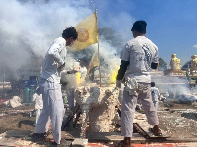 จุดไฟที่เบ้าหลอม โปรยข้าวตอกดอกไม้ที่เบ้าหลอม เปิดงานเททองหล่อพระ คณะพุทธบริษัท ร่วมกันถวายเครื่องไทยธรรมแด่พระสงฆ์ พระสงฆ์ทั้งนั้นอนุโมทนา ประธานและผู้ร่วมพิธีกรวดน้ำ รับพร จนพิธีแล้วเสร็จ