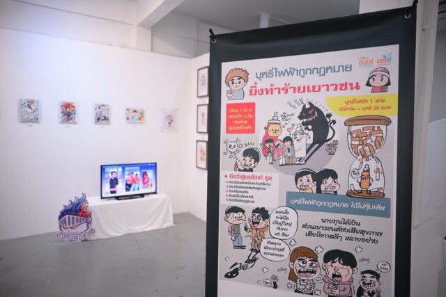 น.ส.รุ่งอรุณ ลิ้มฬหะภัณ ผู้อำนวยการสำนักสนับสนุนการควบคุมปัจจัยเสี่ยงหลัก สำนักงานกองทุนสนับสนุนการสร้างเสริมสุขภาพ. (สสส.) ประธานในพิธีเปิดนิทรรศการ กล่าวว่า การเปลี่ยนแปลงภูมิทัศน์การสื่อสารสู่การหลอมรวมสื่อ (Convergence Media) ในทุกรูปแบบ ส่งผลให้แพลตฟอร์มออนไลน์กลายเป็นช่องทางหลักที่ดึงให้เด็กเยาวชนเข้าสู่กับดักของสินค้าที่ทำลายสุขภาพและสิ่งเสพติดมากขึ้น ทั้งบุหรี่ บุหรี่ไฟฟ้า พนันออนไลน์ และเครื่องดื่มแอลกอฮอล์ สสส. ในฐานะองค์กรขับเคลื่อนการสร้างเสริมสุขภาวะและลดปัจจัยเสี่ยงทางสุขภาพและสังคม จึงให้ความสำคัญการรณรงค์สร้างความตระหนักรู้อันตรายจากปัจจัยเสี่ยง โดยสานพลังร่วมกับภาคีเครือข่ายสุขภาพ และเครือข่ายสื่อมวลชน นักการ์ตูนนิสต์ เครือข่ายละครเพื่อการเรียนรู้ และสถาบันการศึกษา มาร่วมออกแบบผลงานศิลปะและสื่อ TikTok เพื่อพัฒนากระบวนการเรียนรู้ สร้างภูมิคุ้มกันให้กับเด็กเยาวชนให้เท่าทันปัจจัยเสี่ยง ถือเป็นเป็นมิติใหม่ของการทำงานรณรงค์สร้างความตระหนักรู้ในโทษภัยของสิ่งเสพติดและปัจจัยเสี่ยงทางสังคมเรื่องพนันและความปลอดภัยทางถนน