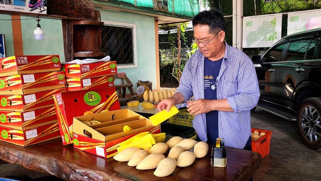 ด้านการตลาด การส่งออกแบ่งเป็น มะม่วงน้ำดอกไม้สีทอง มีการส่งออกไปประเทศ เกาหลี ญี่ปุ่น รัสเซีย สิงคโปร์ มะม่วงเขียวเสวย ฟ้าลั่น มีการส่งออกไปยัง จีน เวียดนาม เป็นหลัก ซึ่งราคามะม่วงที่ทำการส่งออกจะอยู่ที่ 30-40 บาท ต่อกิโลกรัม สำหรับราคาในประเทศ กิโลกรัมละ 22-25 บาท