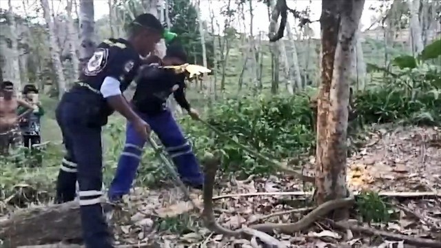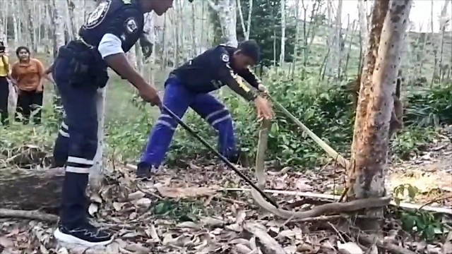 วัยรุ่นได้ยินเสียงดังตุ๊บๆๆ คิดว่านกทะเลาะกัน ออกไปดูพบจงอางกำลังฟัดกัน แจ้งทีมอสรพิษฯมาช่วยจับ