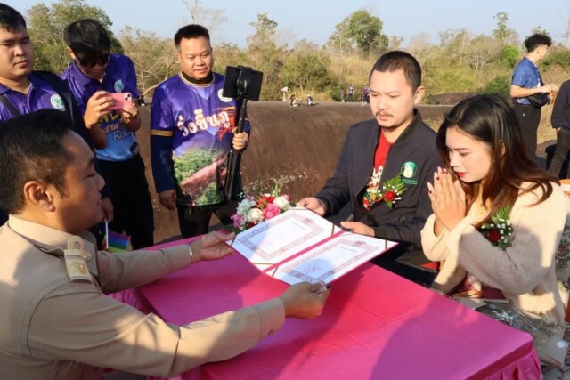 วันที่ 14 ก.พ.68 ที่บริเวณภูสิงห์หินสามวาฬ จังหวัดบึงกาฬ ร่วมกับ อำเภอเมืองบึงกาฬ เทศบาลตำบลโคกก่อง สำนักงานการท่องเที่ยวและกีฬาจังหวัดบึงกาฬ อุทยานป่าภูสิงห์หินสามวาฬจังหวัดบึงกาฬ ท้องถิ่นจังหวัดบึงกาฬ ประชาสัมพันธ์จังหวัดบึงกาฬ โดยมี นายจุมพฎ วรรณฉัตรสิริ ผู้ว่าราชการจังหวัดบึงกาฬ ประธานเปิดงาน พร้อมด้วยนายสมหวัง อารีย์เอื้อ รองผู้ว่าราชการจังหวัดบึงกาฬ นายวรพันธ์ ชำนิยันต์ ปลัดจังหวัดบึงกาฬ นายบัวพันธ์ วงศ์จันทร์ นายกเทศมนตรีโคกก่อง นายณรงค์ศักดิ์ คุรุพันธ์ ท่องเที่ยวและกีฬาจังหวัดบึงกาฬ นายกริชชัย ศิลปะรายะ ท้องถิ่นจังหวัดบึงกาฬ นายประชุม จตุเทน ประชาสัมพันธ์จังหวัดบึงกาฬ หัวหน้าส่วนราชการ ผู้นำชุมชน ประชาชน มาร่วมนำขบวนบ่าวสาว เข้าสู่พิธีจดทะเบียน ซึ่งมีนายธีระพล ขุนพาลเพิง นายอำเภอเมืองบึงกาฬ มาเป็นนายทะเบียนผู้ลงนามในใบสำคัญการสมรสของคู่บ่าวสาว