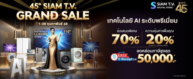 ทั้งนี้สยามทีวีได้เพิ่มพื้นที่ให้บริการ เพื่อรองรับลูกค้าในส่วนต่างๆได้มากขึ้น รวมไปถึงการจัดโปรโมชั่นสินค้าลดราคาฉลองครบครบ 45 ปี แจก!! TV จอใหญ่ 45 เครื่อง เริ่มต้นปีโดยการส่งมอบความสุข ด้วยการจัดแคมเปญสุดพิเศษ กับงาน “สยามทีวี Grand Sale ครบรอบ 45 ปี” วันนี้ – 28 กุมภาพันธ์ 2568 โดยได้นำสินค้าเครื่องใช้ไฟฟ้า มือถือและไอทีจากแบรนด์ดัง ลดสูงสุด 70 % บริการผ่อน 0% นาน 24 เดือน บัตรประชาชนใบเดียวก็ผ่อนได้ พร้อมรับเครดิตคืนสูงสุด 40,000 บาท*