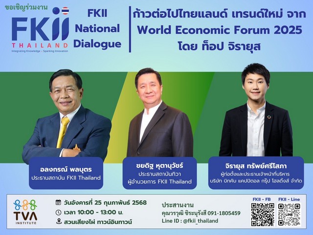 รายงานข่าวจากสถาบันเอฟเคไอไอ.ไทยแลนด์(FKII Thailand) เปิดเผยวันนี้ว่า สถาบันเอฟเคไอไอ.ไทยแลนด์(FKII Thailand) ร่วมกับสถาบันทิวา(TIVA:Transformation Valley Institute) จัดงานเอฟเคไอไอ. ฟอรั่ม ในหัวข้อ “ก้าวต่อไปไทยแลนด์ เทรนด์ใหม่จากสภาเศรษฐกิจโลก (World Economic Forum 2025)“ โดยมีวิทยากรที่จะมาร่วมแลกเปลี่ยนประเด็นแนวโน้มโลกในมิติเศรษฐกิจการเมืองการเปลี่ยนแปลงสภาพภูมิอากาศและเทคโนโลยีกับแนวทางการรับมือของประเทศไทย