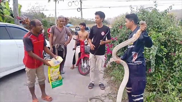 จงอางยาวเกือบ 4 เมตร เลื้อยมาอยู่หน้าบ้าน ผวารีบแจ้งทีมอสรพิษฯมาจับ