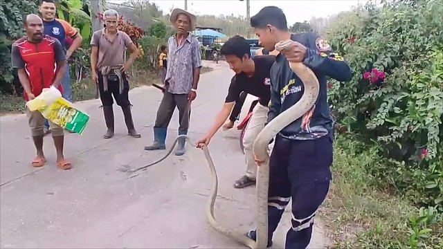 จงอางยาวเกือบ 4 เมตร เลื้อยมาอยู่หน้าบ้าน ผวารีบแจ้งทีมอสรพิษฯมาจับ
