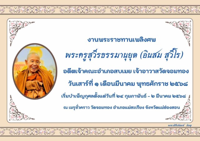 เจ้าพระคุณ สมเด็จพระอริยวงศาคตญาณ สมเด็จพระสังฆราช สกลมหาสังฆปริณายก ทรงโปรดประทานผ้าไตรและช่อดอกไม้จันทน์ เพื่อใช้ในการพระราชทานเพลิงศพ พระครูสุวีรธรรมานุยุต อดีตเจ้าอาวาสวัดจอมทอง อดีตเจ้าคณะอำเภอสบเมย ในวันเสาร์ที่ 1 เดือนมีนาคม พุทธศักราช 2568 ณ เมรุชั่วคราว วัดจอมทอง อำเภอแม่สะเรียง จังหวัดแม่ฮ่องสอน
