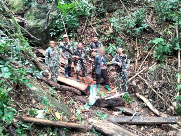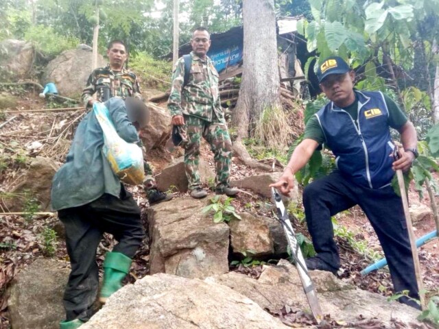 พบชายต้องสงสัยกำลังเดินอยู่ในแปลงกาแฟ สะพายถุงปุ๋ย มือขวาถือมีดพร้า มือซ้ายถือบาร์เลื่อยยนต์ จึงแสดงตัวและขอตรวจค้น ทราบชื่อว่านายอาวุธ (สงวนนามสกุล) อายุ 41 ปี ชาว จ.พัทลุง ตรวจดูในถุงปุ๋ยมีโซ่เลื่อยยนต์ หัวเทียน และอุปกรณ์ซ่อมเครื่องเลื่อยโซ่ยนต์หลายรายการ โดยสังเกตเห็นว่ามือของชายคนดังกล่าวเปื้อนน้ำมันโซ่ยนต์จนมีสีดำทั้งสองมือ