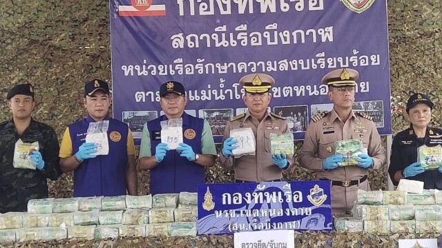 บึงกาฬ- ทหารเรือ นรข.ร่วมหน่วยความมั่นคงแถลงตรวจยึดยาไอซ์ 117 กก. รวบ2ผัวเมีย พร้อมของกลางริมถนนหลวง