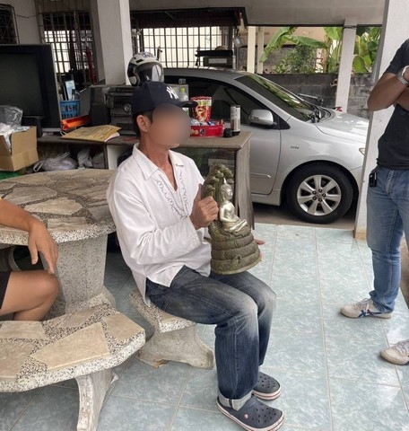 สังเกตเห็นว่าพระพุทธรูปหายไป จึงได้เปิดกล้องวงจรปิดตรวจสอบพบผู้ต้องสงสัยเป็นชายสวมกางเกงขายาวสีกรมหรือดำ ใส่รองเท้าสวม ใส่เสื้อแขนยาว สีขาวปล่อยชาย สวมหมวกสะพายกระเป๋าสีดำไว้ข้างหน้า ขับขี่รถจักรยานยนต์ อฮนด้าเวฟ สีแดง ทะเบียน กจพ 4