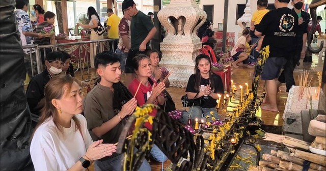 นครนายก – นักท่องเที่ยวเข้ากราบไหว้องค์หลวงพ่อปากแดงพร้อมขอพร โชคลาภ ธุรกิจ หน้าที่การงาน พร้อมส่องเลขเด็ดในอ่างน้ำมนต์ ใกล้วันหวยออก