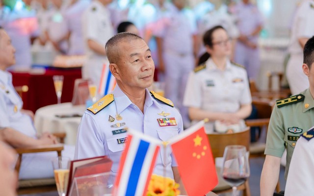 พร้อมด้วยคณะผู้บังคับบัญชา และกำลังพลหมู่เรือฝึกผสม Blue Strike 2025 รวมทั้งนักเรียนนายเรือ ได้เข้าร่วมงานเลี้ยงรับรองบนเรือรบจีน บริเวณท่าเทียบเรือ Maxie เมืองจ้านเจียง สาธารณรัฐประชาชนจีน เพื่อเป็นการเชื่อมความสัมพันธ์ไมตรี เสริมสร้างความไว้เนื้อเชื่อใจ และพัฒนาความร่วมมือในการรักษาสันติภาพและความมั่นคงในภูมิภาค