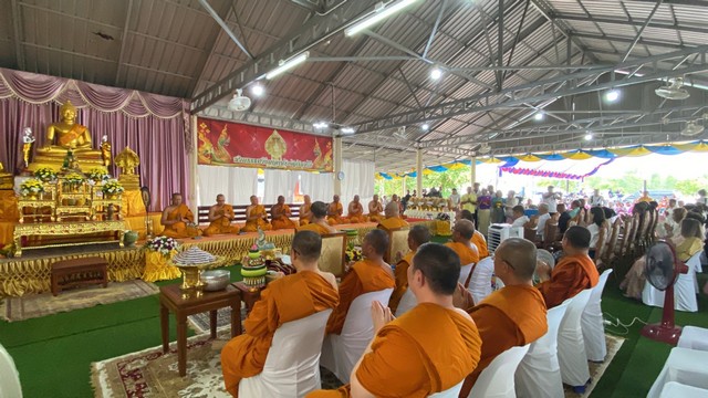 พระสงฆ์จำนวน 9 รูป เจริญ พุทธมนต์ ถวายเครื่องไทยธรรมแด่พระสงฆ์ กรวดน้ำและรับพร และถวายภัตตาหารเพล ประธานฝ่ายฆราวาสได้ถวายที่ดิน หัวหน้าส่วนราชการ และ แขกผู้มีเกียรติที่มาร่วมงาน เป็นจำนวนมาก ร่วมรับประทานอาหาร เป็นอันเสร็จพิธี