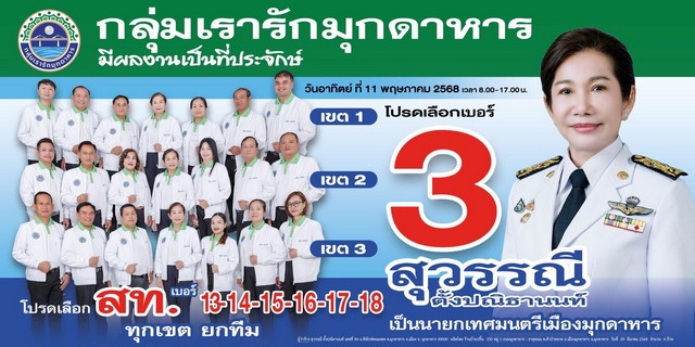 กลุ่มเรารักมุกดาหาร หมายเลข 3 นางสุวรรณี ตั้งปณิธานนท์ ผู้สมัครว่าที่นายกเทศมนตรีเมือง ผู้สมัคร ส.ท. 13-18 ทั้ง 3 เขต