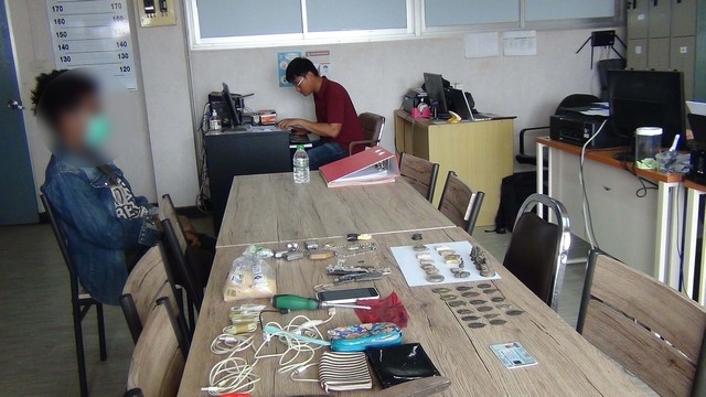 เจ้าหน้าที่ชุดสืบสวนจึงได้ลงพื้นที่สืบสวนจนทราบว่าบุคคลดังกล่าว คือนายอภิรักษ์ หรือออย (นามสมมุติ)อายุ 23 ปี ซึ่งมีลักษณะสักลายหน้ายักษ์ พฤติการณ์เกี่ยวข้องกับยาเสพติดจึงได้ติดตามจับกุมบริเวณบ้านพักเลขที่ 29 ม.13 ต.โพนทราย อ.เมืองมุกดาหาร เจ้าหน้าที่ได้ทำการตรวจยึดสิ่งของตามบัญชีของกลางไว้เพื่อตรวจสอบ ดังนี้ กรรไกรตัดหญ้า 1 อัน กรรไกรตัดผ้า 1 อัน สายชาร์จโทรศัพท์มือถือ 9 เส้น ไขควง 1 อัน โทรศัพท์มือถือ 1 เครื่อง กระเป๋าถือใบเล็ก 3 ใบ ตะกรุด 1 อัน พระเครื่องตามบัญชีภาพถ่าย 35 องค์ พระเครื่องพร้อมสร้อย 7 องค์ น้ำตาล 1 ถุง พริกป่น 1 ถุง กล้องส่องพระ 1 อัน เงินเหรียญ 6 เหรียญ และเมมโมรี่การ์ด 1 อัน เจ้าหน้าที่ได้นำตรวจปัสสาวะพบผลตรวจเป็นสีม่วง เจ้าหน้าตำรวจจึงควบคุมตัวพร้อมแจ้งข้อกล่าวหา ก่อนนำตัวส่ง พนักงานสอบสวน สภ.เมืองมุกดาหาร เพื่อดำเนินคดีตามกฎหมายต่อไป