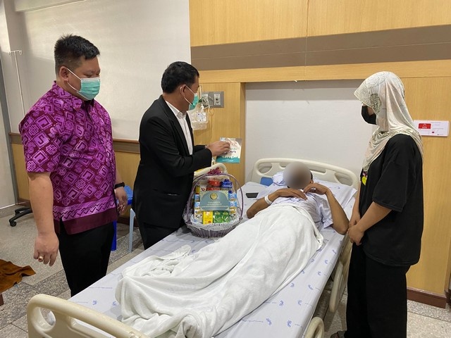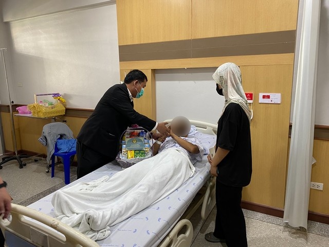 โดยในการนี้ ผู้ช่วยเลขาธิการ ศอ.บต. ได้พูดคุยให้กำลังใจ พร้อมมอบกระเช้าเยี่ยมในนาม เลขาธิการ ศอ.บต. เพื่อเป็นขวัญกำลังใจแก่ผู้ได้รับบาดเจ็บ