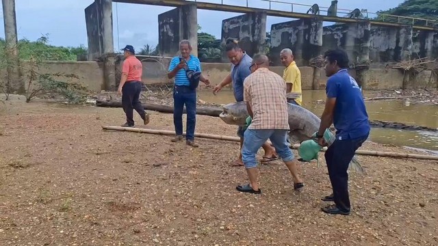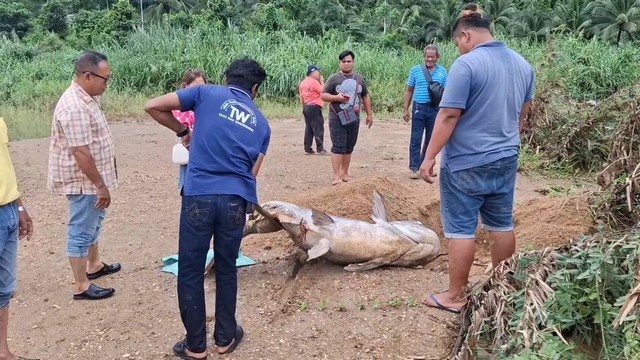 เมื่อวันที่ 13 พ.ค. 68 ผู้สื่อข่าวรายงานว่า นายวิสิทธิ์ ขวัญดี หัวหน้า กลุ่ม บริหารจัดการด้านการประมง สำนักงานประมงจังหวัดพังงา ได้รับแจ้งจากชาวบ้าน ว่าที่บริเวณ ฝายน้ำล้นคลองพังงา หมู่ 3 ตำบลถ้ำน้ำผุด อำเภอเมือง จังหวัดพังงา พบซากปลา ขนาดใหญ่ลอยอยู่ หน้าสายน้ำล้นดังกล่าว จึงพร้อมด้วย น.ส.จาฏุพัจน์ สวัสดิ์วงศ์ ประมงอำเภอเมืองพังงา นายสมทบ หมาดสตูล ผู้ใหญ่บ้านฝ่ายท่า หมู่ 2 ตำบลถ้ำน้ำผุด อำเภอเมือง จังหวัดพังงา เข้าตรวจสอบ