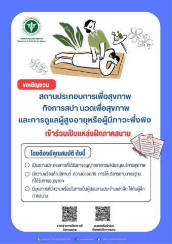 ทั้งนี้ กรม สบส. เชื่อว่ามาตรฐานดังกล่าวเป็นหนึ่งในกลไกสำคัญในการขับเคลื่อนให้ประเทศไทยก้าวสู่ศูนย์กลางสุขภาพของโลก จึงขอเชิญชวนสถานประกอบการเพื่อสุขภาพ ทั้งกิจการสปา นวดเพื่อสุขภาพ และการดูแลผู้สูงอายุหรือผู้มีภาวะพึ่งพิง ร่วมเป็นแหล่งฝึกภาคสนามเพื่อผลิตบุคลากรคุณภาพป้อนเข้าสู่ตลาดสุขภาพไทย โดยสามารถตรวจสอบรายละเอียดเพิ่มเติมได้ที่เว็บไซต์ กองสถานประกอบการเพื่อสุขภาพ (https://hemd.hss.moph.go.th) หรือหมายเลขโทรศัพท์ 0 2193 7000 ต่อ 18411 ในวันและเวลาราชการ ได้ตั้งแต่บัดนี้เป็นต้นไป