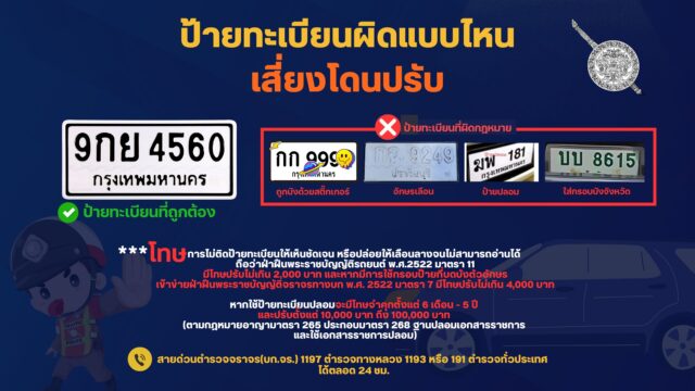 ทั้งนี้ พล.ต.ท.นิธิธรฯ ย้ำว่า การไม่ติดป้ายทะเบียนให้เห็นชัดเจน หรือปล่อยให้เลือนลางจนไม่สามารถอ่านได้ ถือว่าฝ่าฝืนพระราชบัญญัติรถยนต์ พ.ศ.2522 มาตรา 11 มีโทษปรับไม่เกิน 2,000 บาท และหากมีการใช้กรอบป้ายที่บดบังตัวอักษร เข้าข่ายฝ่าฝืนพระราชบัญญัติจราจรทางบก พ.ศ. 2522 มาตรา 7 มีโทษปรับไม่เกิน 4,000 บาท โดยกฎหมายกำหนดไว้อย่างชัดเจนว่าต้องติดแผ่นป้ายทะเบียนให้สามารถมองเห็นได้โดยสะดวก และต้องไม่มีการปิดบังหรือทำให้แผ่นป้ายชำรุด