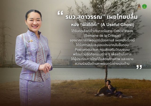 “รมว.สุดาวรรณ” เผยไทยปลื้มหนัง “ผีใช้ได้ค่ะ” (A Useful Ghost) ได้รับคัดเลือกเข้าประกวดในสาย Critics’ Week (Semaine de la Critique) ของเทศกาลภาพยนตร์เมืองคานส์ เผยหนังเรื่องนี้ได้รับการสนับสนุนงบประมาณในขั้นตอน Post-production กรมส่งเสริมวัฒนธรรม พร้อมร่วมจัดกิจกรรมต่าง ๆ เพื่อสร้างโอกาสให้ผู้ประกอบการไทยได้แสดงศักยภาพ และขยายความร่วมมือด้านภาพยนตร์อย่างรอบด้าน
