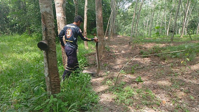 จงอางตัวใหญ่ยาว 3.50 เมตร กินงูสิงหางลาย คนกรีดยางผวา รีบแจ้งทีมอสรพิษวิทยาภาคใต้ มาจับ แห่ตีเลขเด็ด