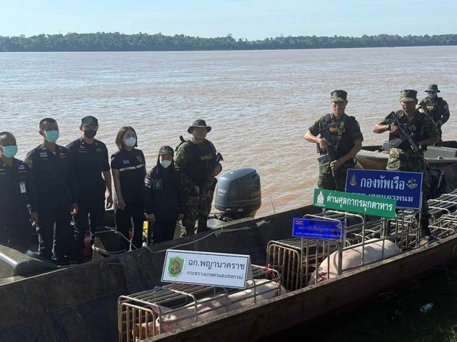 มุกดาหาร -นรข.มุกดาหาร โชว์ผลงานจับเรือขนหมูเถื่อนขณะลักลอบข้ามโขงส่งลาว ยึด 11 ตัว