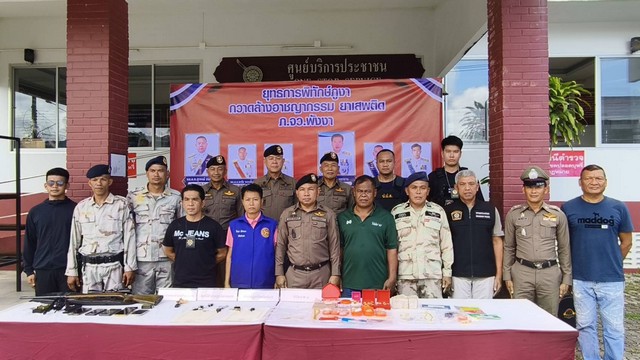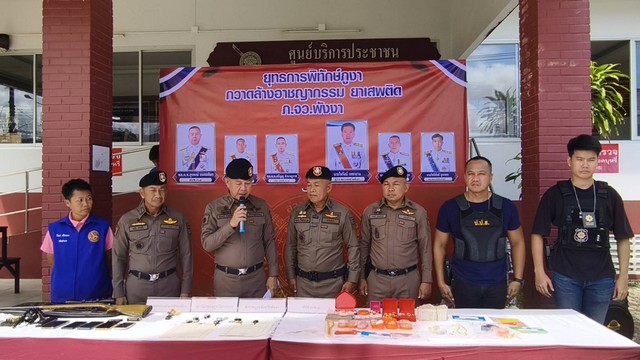เมื่อวันที่ 17 มิ.ย 68 ผู้สื่อข่าวรายงานว่า ที่บริเวณ หน้าสถานีตำรวจภูธรโคกกลอย อำเภอตะกั่วทุ่ง จังหวัดพังงา พล.ต.ท.สุรพงษ์ ถนอมจิตร ผู้บัญชาการตำรวจภูธรภาค 8 พร้อมด้วย พล.ต.ต.พรชัย ขจรกลิ่น รองผู้บัญชาการตำรวจภูธรภาค 8 พล.ต.ต. สมชาย ซื่อต่อตระกูล ผู้บังคับการตำรวจภูธรจังหวัดพังงา พ.ต.อ.วรพงษ์ พรหมอินทร์ ผกก.สภ.โคกกลอยนายโชคพันธ์ จุลเพชร ผู้อำนวยการ สำนักงาน ป้องกันและปราบปรามยาเสพติด (ปปส.)ภาค 8 ชุดสืบสวน ปลัดอำเภอ ฝ่ายปกครอง อส. และ เจ้าหน้าที่ตำรวจภูธรจังหวัดพังงา ร่วมแถลงข่าว หลังจาก เปิดปฏิบัติการ พิทักษ์ภูงา และมีการจับกุม นายสิทธิพันธ์ฯ (นามสมมุติ) อายุ 30 อาชีพเลี้ยงวัวบังหน้า อ.ท้ายเหมือง จ.พังงา