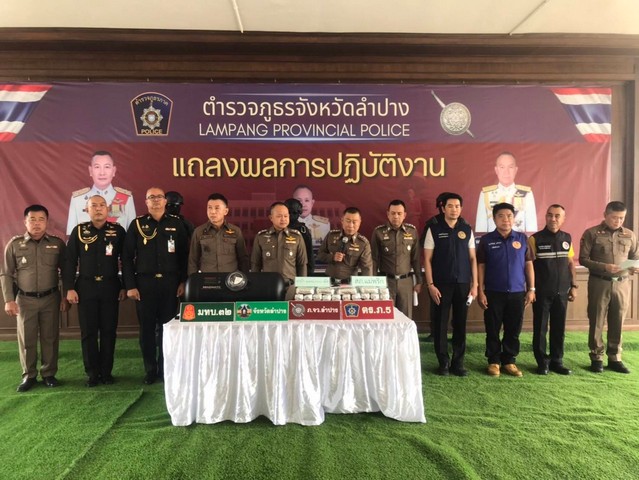 วันที่ 18 มิถุนายน 2568 เวลา 14.00 น. ณ ที่ทำการตำรวจภูธรจังหวัดลำปาง (แห่งใหม่) พล.ต.ต.ภูมิปัญญ์ญา นวตระกูลพิสุทธิ์ ผู้บังคับการตำรวจภูธรจังหวัดลำปาง พร้อมด้วยเจ้าหน้าที่ตำรวจ ทหาร กอ.รมน. และฝ่ายปกครอง ร่วมแถลงผลการจับกุมคดียาเสพติดรายสำคัญ ยึดยาบ้าของกลางจำนวนกว่า 198,000 เม็ด พร้อมผู้ต้องหา 2 ราย ขยายผลเครือข่ายขนยาเสพติดจากภาคเหนือเข้าสู่พื้นที่ตอนใน