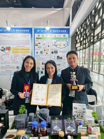 โดยนายณัฐวุฒิ รอดทุกข์ น.ส.เนตรนภา กำลังมาก รศ.ดร.ปรียาภรณ์ ไชยสัตย์ และรศ.ดร.อมร ไชยสัตย์ คณะวิทยาศาสตร์และเทคโนโลยี (2) ผลงาน AntibacDotFilm: Polyvinyl alcohol film mixed sugar derived-carbon dots for food packaging with antibacterial activity ได้รับรางวัล Gold Medal และNRCT Special Award โดยน.ส.พัชรพร ขาวเผือก และรศ.ดร.กนกอร เวชกรณ์ คณะวิทยาศาสตร์และเทคโนโลยี (3) ผลงาน Eco-friendly textile inovations employ natural dyes derived from Dry Areca nut (Areca catechu) ได้รับรางวัล Gold Medal และNRCT Honorable Mention Award โดยนายภวัณพัสตร์ แก่นแก้ว และผศ.ดร.ศุภนิชา ศรีวรเดชไพศาล คณะเทคโนโลยีคหกรรมศาสตร์