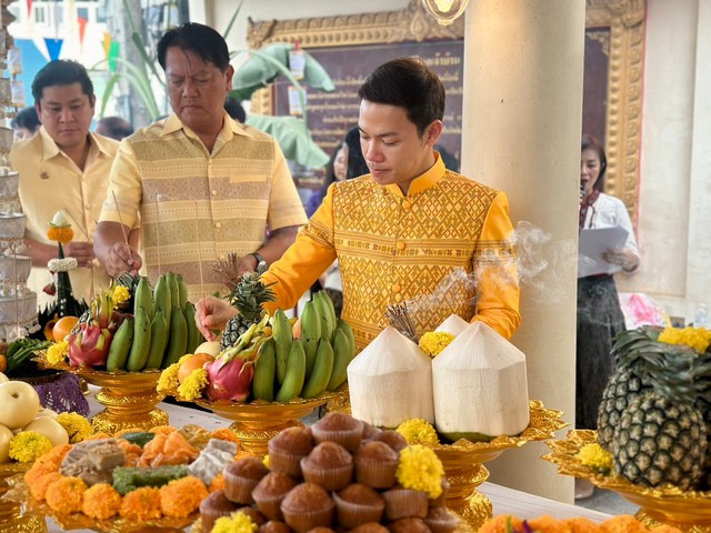 ทั้งนี้ในช่วงเช้าของวันที่ 18 มิถุนายน 2568 มีพิธีบวงสรวงและถวายเครื่องสังเวยหอเจ้าบ้าน โดยนายกีรฒิการย์ ประธานในพิธีได้จุดธูปเทียน ถวายพวงมาลัย ดอกไม้สักการะหอเจ้าบ้าน พราหมณ์ในพิธีกล่าวชุมนุมเทวดา กล่าวคำถวายเครื่องสังเวยเครื่องสักการะหอเจ้าบ้าน ศาลปู่แฮ่ ปู่หาญ ปู่กุลาบุญโฮม ปู่บุญตากุดโง้ง ปู่ตากุดน้ำกิน พราหมณ์ในพิธีกล่าวคำขอขมา และคำบวงสรวง ปักธูปหางเครื่องพร้อมโปรยข้าวตอกดอกไม้ และนำข้าราชการ พ่อค้า ประชาชน ปักธูปหางเครื่องและวางพวงมาลัย เพื่อสักการะหอเจ้าบ้าน