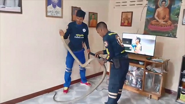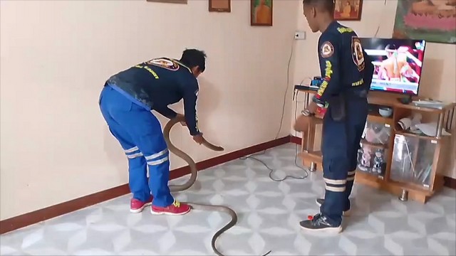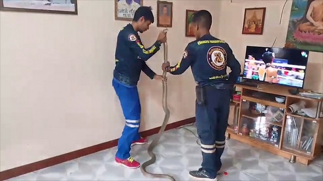 เมื่อไปถึงเจ้าหน้าที่จึงได้เข้าตรวจสอบที่หลังตู้ชั้นวางทีวีก็พบงูจงอางตัวใหญ่นอนขดตัวอยู่หลังตู้ชั้นวางทีวี จึงเข้าใช้มือเปล่าจับงูจงอางแล้วลากออกมา ก่อนจะใช้มือเปล่าๆจับหัวงูจงอางไว้ได้ นำมาวัดได้ความยาวถึง 3.10 เมตร รีบนำใส่กระสอบเตรียมนำไปปล่อยคืนสู่ป่าธรรมชาติที่อยู่ห่างไกลบ้านเรือนผู้คนต่อไปเพื่อความปลอดภัย