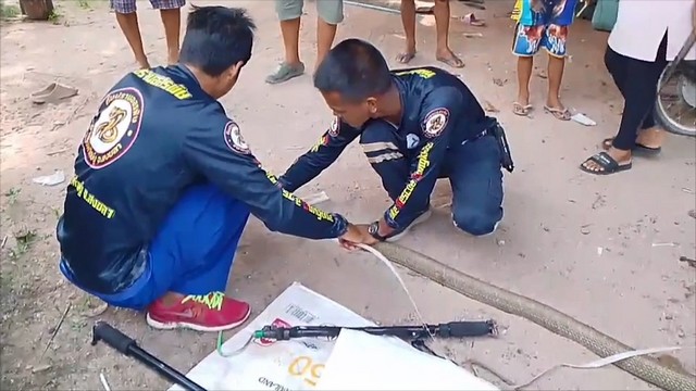 หลังจากที่นายทวีศักดิ์ บุญเศษ และนาย อภิชาติ พรหมสงค์ เจ้าหน้าที่ ทีมอสรพิษวิทยาภาคใต้ และ ทีมปราบอสรพิษอาสาพิทักษ์งู จ.สงขลา จึงได้รีบนำอุปกรณ์ในการจับงูเข้าตรวจสอบและจับทันที