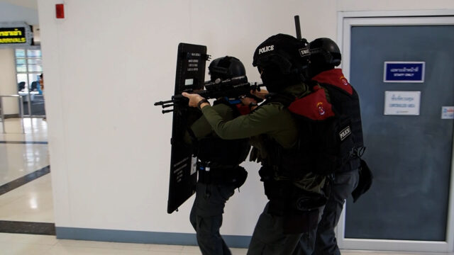 โดยจำลองเหตุการณ์ มีคนร้ายจำนวน 1 คน พกอาวุธปืนเข้ามาก่อเหตุภายในอาคาร ห้องโถงผู้โดยสาร บริเวณเคาน์เตอร์เช็คอินท่าอากาศยานแม่ฮ่องสอน โดยทำการกราดยิงผู้โดยสาร และจับตัวประกัน เรียกร้องจะขึ้นเครื่องบินเพื่อหลบหนีความผิด โดยมีการใช้แผนเผชิญเหตุท่าอากาศยาน และสั่งจัดตั้งศูนย์ปฏิบัติการฉุกเฉิน (สำรอง) Emergency Operation Center : EOC โดยร้องขอหน่วยสนับสนุนตามผังเผชิญเหตุท่าอากาศยาน มีการส่งทีมเจรจาต่อรอง เพื่อให้ปล่อยตัวประกัน เมื่อระยะเวลาผ่านไป การเจรจาไม่สำเร็จ เจ้าหน้าที่ตำรวจจึงร้องขอหน่วย ปฏิบัติการพิเศษ เพื่อเข้าปฏิบัติการตามยุทธวิธี ในการระงับเหตุ จึงทำให้ผู้ก่อเหตุถูกวิสามัญ และเข้าช่วยเหลือตัวประกันได้สำเร็จปลอดภัย