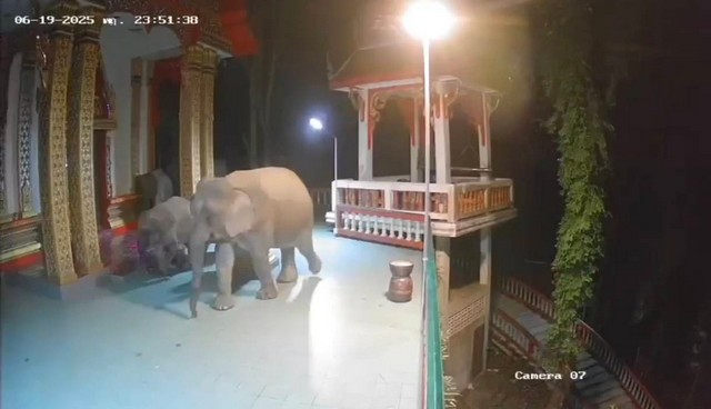 นครนายก ช้างป่า1โขลงกว่า10 ตัวได้เดินขึ้นมาบนโบสถ์ขณะพระสวดมนต์นั่งสมาธิทำให้แท็งค์น้ำเสียหาย