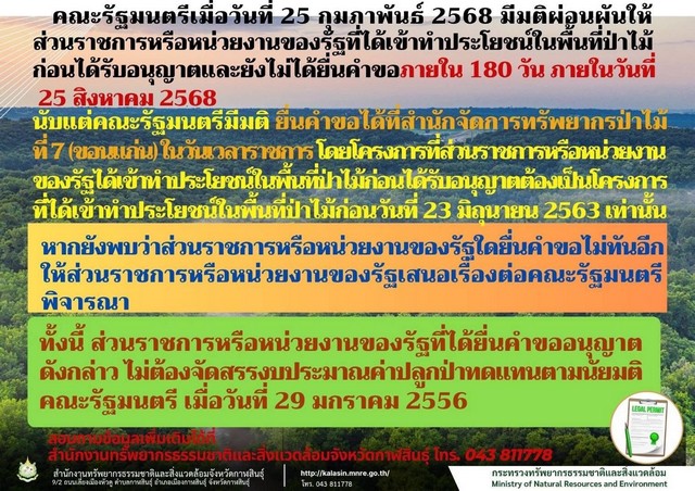 ทสจ.กาฬสินธุ์ เน้นย้ำและประชาสัมพันธ์ถึงส่วนราชการ หรือหน่วยงานของรัฐที่รวมถึงองค์กรปกครองส่วนท้องถิ่นได้เข้าทำประโยชน์ในพื้นที่ป่าไม้ยื่นคำขอให้ถูกต้องถามกฎหมายภายในวันที่ 25 สิงหาคม 2568 นี้