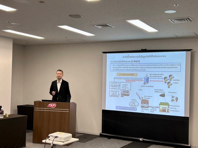 , Disaster Management Division, Civil Protection and Disaster Management Department ในประเด็นระบบ J-Alert การพัฒนาโครงสร้างพื้นฐานการแจ้งเตือนภัยพิบัติ การใช้เทคโนโลยี AI และ IoT ในการบริหารจัดการภัยพิบัติ การบริหารจัดการภาวะฉุกเฉินและการสื่อสารในช่วงภัยพิบัติ และการส่งเสริมความร่วมมือไทย – ญี่ปุ่น ในการพัฒนาโครงการป้องกันภัยพิบัติ ณ TKP Sinbashi shiodome Conference center