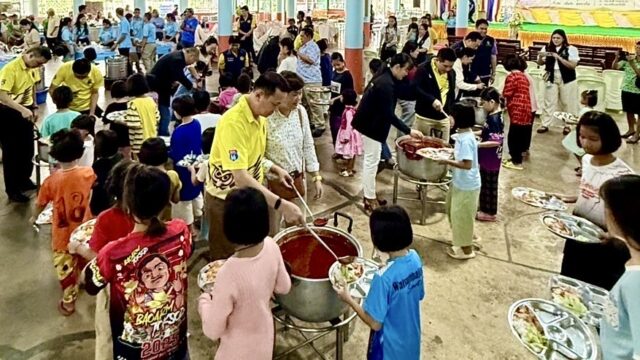 นอกจากมอบน้ำสะอาด กลุ่มยังได้จัดเลี้ยงอาหารกลางวันให้แก่เด็กนักเรียนกว่า 1,015 คน พร้อมทั้งถวายภัตตาหารเพลแด่พระภิกษุสงฆ์