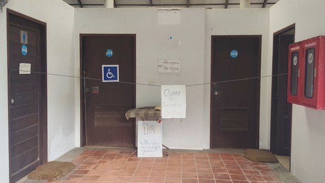 โดยด้านหน้านมีการขึ้นป้ายไว้ว่าปิดปรับปรุงจนกระทั่งตอนนี้ก็ยังไม่มีการซ่อมแซมดูแล ห้องน้ำสาธารณะแห่งนี้ตั้งอยู่ไม่ห่างจากชายหาดนางทอง ทุกๆวันจะมีนักท่องเที่ยวมาเที่ยวชมพระอาทิตย์ตกน้ำ เล่นน้ำทะเลกันจำนวนมากแต่ห้องน้ำสาธารณะกลับใช้ไม่ได้นักท่องเที่ยวทั้งไทยทุ้งต่างชาติเดือดร้อน ส่วนศาลานั่งพักผ่อนที่อยู่ใกล้กับห้องน้ำสาธารณะมีสภาพผูพังเช่นกัน ฝ้าหลุดร่วงเหลือแต่โครงฝ้า ปลั๊กไฟเป็นสนิมใช้การไม่ได้