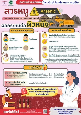 ซึ่งการได้รับสารหนูในระยะยาว อาจทำให้เกิดการเปลี่ยนแปลงของผิวหนัง เช่น ผิวคล้ำหรือเข้มขึ้น โดยเฉพาะบริเวณรักแร้ ขาหนีบ ฝ่ามือ และฝ่าเท้า โดยอาจมีจุดสีซีดแทรกอยู่บนผิวคล้ำ เรียกว่า “Raindrop on a dusty road” และอาจพบอาการผมร่วงร่วมด้วย หรือตุ่มนูนแข็งสีเหลืองคล้ายเมล็ดข้าวโพด (Arsenical keratoses) บริเวณฝ่ามือและฝ่าเท้า ในบางรายอาจพบความผิดปกติที่ขา หรือโรคที่เรียกว่า “เท้าดำ” ซึ่งเกี่ยวข้องกับการไหลเวียนเลือด หากมีข้อสงสัยหรือพบอาการผิดปกติที่ผิวหนัง ประชาชนสามารถเข้ารับการตรวจวินิจฉัยได้ โดยมีการตรวจระดับสารหนูในเลือด ปัสสาวะ เส้นผม หรือเล็บ โดยค่าปกติในเลือดอยู่ที่ 0–13 ไมโครกรัม/ลิตร และในปัสสาวะ 0–35 ไมโครกรัม/ลิตร หากตรวจพบเกินเกณฑ์ แพทย์อาจพิจารณาตรวจเพิ่มเติม เช่น การตรวจชิ้นเนื้อผิวหนัง