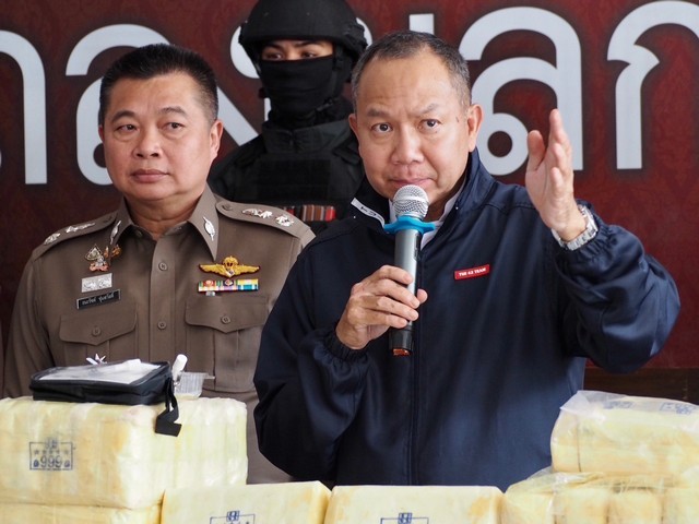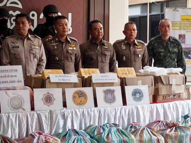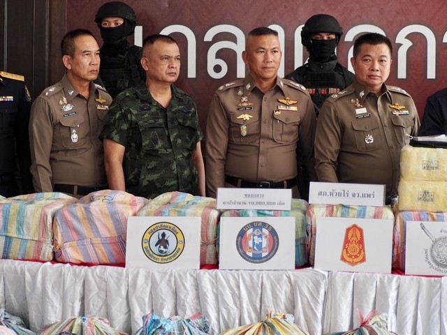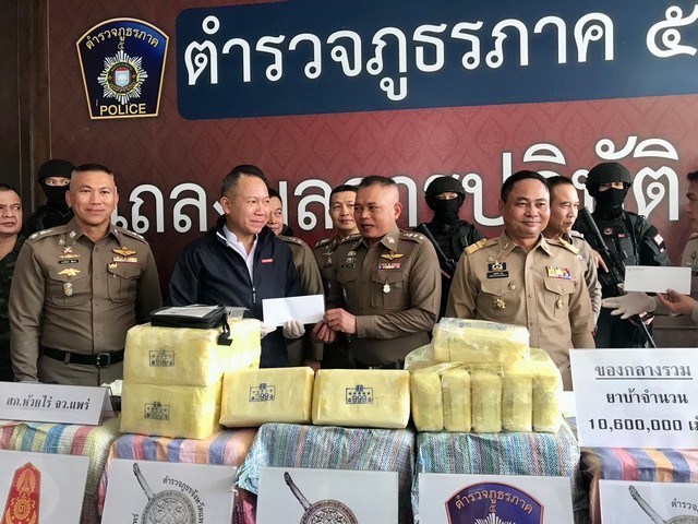 ร่วมกันแถลงผลการจับกุมยาเสพติด และสืบสวนขยายผลคดียาเสพติดรายสำคัญ ของ สภ.ห้วยไร่ อ.เด่นชัย จ.แพร่ บูรณาการร่วมหน่วยเกี่ยวข้อง จับกุมผู้ต้องหา 1 คน รถยนต์บรรทุก 6 ล้อ 1 คัน ยาบ้า 50 กระสอบ รวมประมาณ 10 ล้านเม็ด ซุกซ่อนในลำโพงเครื่องเสียง และกรณีตรวจยึดยาเสพติด จำนวน 600,000 เม็ด บรรจุมาในกล่องพัสดุของขนส่งเอกชน ในพื้นที่ สภ.เมืองเชียงราย จ.เชียงราย ณ ลานแถลงข่าว อาคารกองบังคับการสืบสวนสอบสวน ตำรวจภูธรภาค 5 อ.เมืองเชียงใหม่ จ.เชียงใหม่
