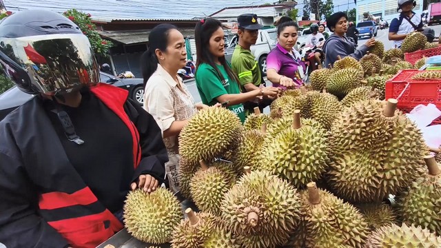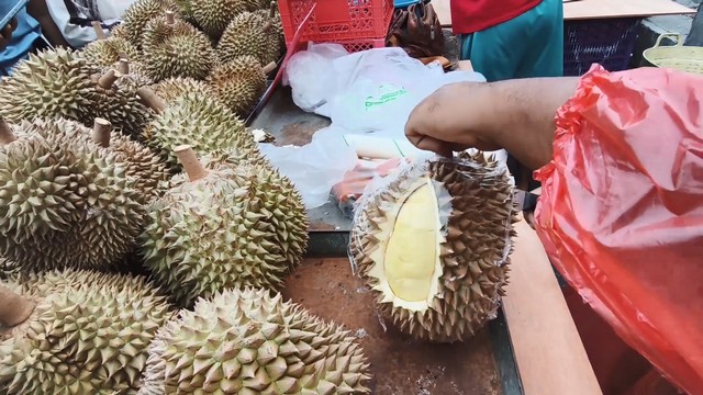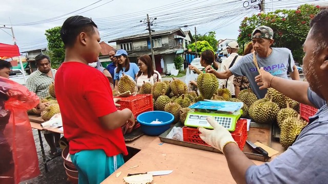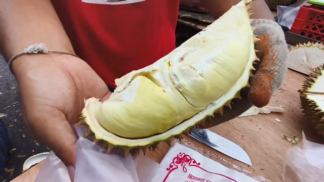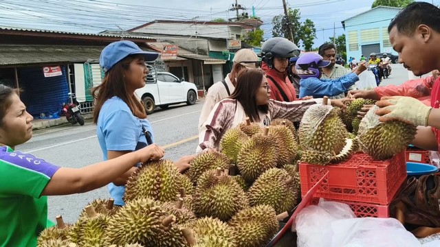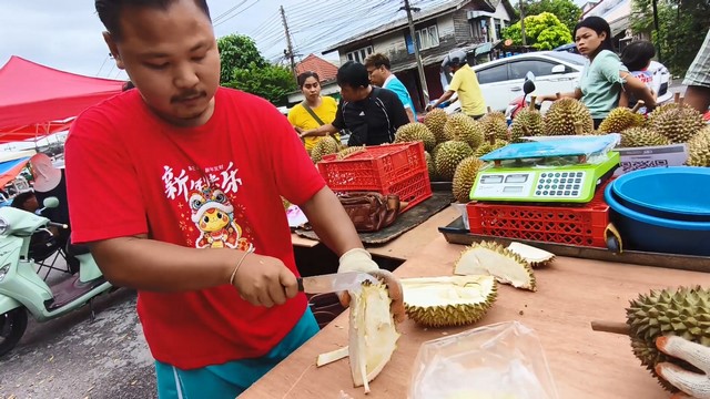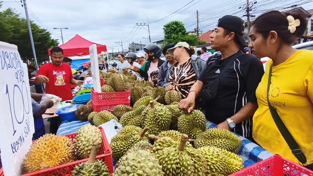 นายภัทราวุธ หรือเม่น พิณสุวรรณ กล่าวว่า ทุเรียนที่นำมาวันนี้ มาจากจังหวัดระยอง และ บ้านทรายขาว จังหวัดปัตตานี โดยขายในราคา กิโลกรัมละ 100 บาท ซึ่งเป็นทุเรียนหมอนทองจากจังหวัดระยอง ทุเรียนหมอนทองบ้านทรายขาว กิโลกรัมละ 120 บาทและทุเรียนชะนีไข่ บ้านทรายขาว กิโลกรัมละ 90 บาท สำหรับคุณภาพของทุเรียน เปลือกบาง เนื้อดีมาก ทุเรียนแก่มาก ปีนี้ราคาไม่แพง ลูกค้าเยอะมาก เอาไม่ทันเลย