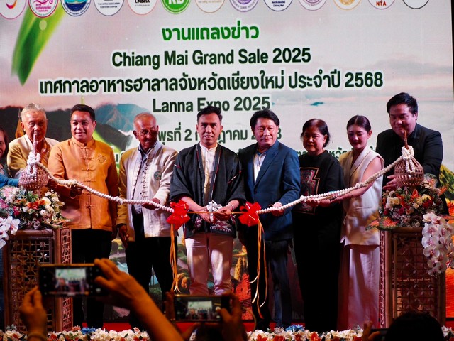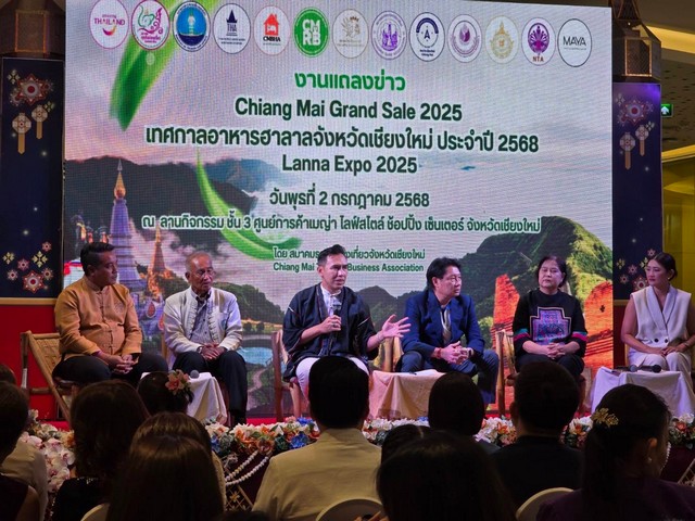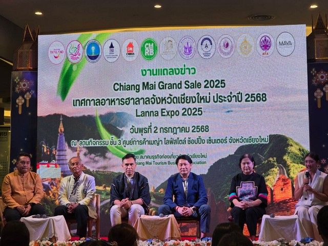 วันพุธที่ 2 กรกฎาคม 2568 นายวีรพงศ์ ฤทธิ์รอด รองผู้ว่าราชการจังหวัดเชียงใหม่ พร้อมด้วย นายศุภมิตร กิจจาพิพัฒน์ นายกสมาคมธุรกิจท่องเที่ยวจังหวัดเชียงใหม่, นายอิทธิรัฐ สินารักษ์ ท่องเที่ยวและกีฬาจังหวัดเชียงใหม่ นางกนกรัตน์ ยุกติรัตน์ พาณิชย์จังหวัดเชียงใหม่, นางสาวฉัตรชนก ทองสำฤทธิ์ รองผู้อำนวยการการท่องเที่ยวแห่งประเทศไทย สำนักงานเชียงใหม่ และนายอนันต์ ปัญญาวี รองประธานคณะกรรมการอิสลามประจำจังหวัดเชียงใหม่ ร่วมกันแถลงข่าวการจัดงาน Chiang Mai Grand Sale 2025, การเข้าร่วมจัดแสดงสินค้าในงาน Lanna Expo 2025 และเทศกาลอาหารฮาลาล ปี 2568 โดยมี นายกสมาคม ตัวแทนนายกสมาคม และพันธมิตรภาคการท่องเที่ยว ตลอดจนผู้มีเกียรติ ร่วมงานแถลงข่าว ณ ชั้น 3 ศูนย์การค้าเมญ่า ไลฟ์สไตล์ ช้อปปิ้ง เซ็นเตอร์