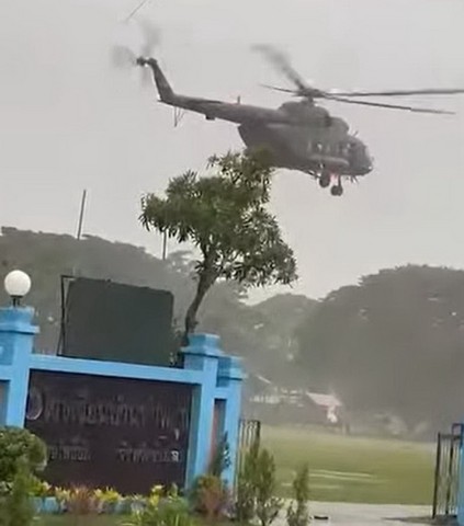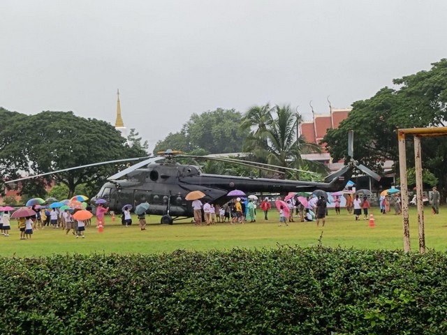 เฮลิคอปเตอร์ MI 17 ทหารลงจอดฉุกเฉินที่สนามฟุตบอลโรงเรียนบ้านคำพอุง จ.ร้อยเอ็ด หลังฝนตกหนัก ทัศนวิสัยการมองเห็นไม่ดี(ต่ำ) ขณะที่ชาวบ้านผูกแขนเรียกขวัญ ส่วนเด็กๆ ตื่นเต้นแห่ชมเฮลิคอปเตอร์ใกล้ชิด