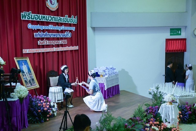 คณะพยาบาลศาสตร์ มหาวิทยาลัยเชียงใหม่ จัดพิธีมอบหมวกและเข็มชั้นปีแก่นักศึกษาพยาบาลชั้นปีที่ 3 ประจำปีการศึกษา 2568 (Capping and Pinning Ceremony 2025) โดยมี ผู้ช่วยศาสตราจารย์ ดร.สุภารัตน์ วังศรีคูณ คณบดีคณะพยาบาลศาสตร์ เป็นประธาน ภายในงานได้รับเกียรติจาก ผู้แทนหัวหน้าฝ่ายการพยาบาล โรงพยาบาลมหาราชนครเชียงใหม่ ผู้แทนสมาคมพยาบาลแห่งประเทศไทยฯ สาขาภาคเหนือ นายกสมาคมศิษย์เก่าพยาบาลศาสตร์ มหาวิทยาลัยเชียงใหม่ พร้อมด้วยคณาจารย์ บุคลากร นักศึกษา และ ผู้ปกครองของนักศึกษา ร่วมแสดงความยินดีอย่างอบอุ่น ณ ห้องประชุมวิจิตร ศรีสุพรรณ อาคาร 2 เมื่อวันเสาร์ที่ 5 กรกฎาคม 2568