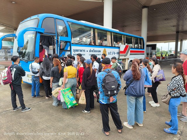 เมื่อวันที่ 8 กรกฎาคม 2568 ผู้สื่อข่าวรายงานจากจังหวัดมุกดาหารว่า บริเวณสถานีขนส่งผู้โดยสารจังหวัดมุกดาหาร และด่านพรมแดนสะพานมิตรภาพไทย-ลาวแห่งที่ 2 (มุกดาหาร–สะหวันนะเขต) อำเภอเมือง จังหวัดมุกดาหาร มีแรงงานข้ามชาติจาก สปป.ลาว และกัมพูชา เดินทางมาจำนวนมาก โดยส่วนใหญ่เดินทางมาจากกรุงเทพมหานคร จังหวัดจันทบุรี และตราด เพื่อใช้บริการรถโดยสารระหว่างประเทศ (มุกดาหาร–สะหวันนะเขต) ข้ามสะพานมิตรภาพแห่งที่ 2 เข้าด่านพรมแดนสะหวันนะเขต สปป.ลาว และข้ามกลับเข้ามาประเทศไทยโดยผ่านตรวจคนเข้าเมืองจังหวัดมุกดาหาร เพื่อกลับเข้ามาอยู่และทำงานต่อในประเทศไทยอย่างถูกต้องตามกฎหมาย