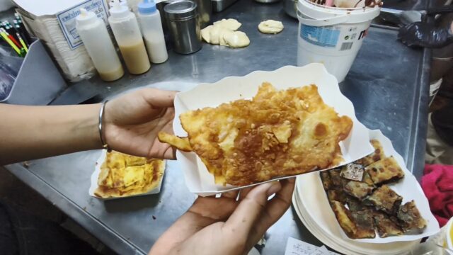 โรตีบังชรีฟของหรอยเมืองสงขลา เมนูแนะนำต้องลอง เมนูเด็ดอย่างหรอย โรตีมะตะบะปูผัดผงกะหรี่ (มีน้ำแกงกะหรี่ถั่วในเซท) โรตีมะตะบะไก่ผัดเครื่องเทศ