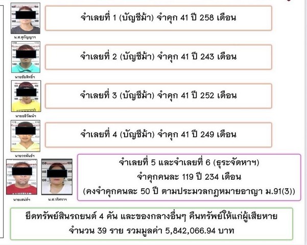 นอกจากนี้ พล.ต.อ.ธัชชัยฯ เตือนเข้มอย่าเป็นคนไทยขายชาติที่ไปร่วมขบวนการอาชญากรรมข้ามชาติแก๊งคอลเซ็นเตอร์ เพราะการดำเนินคดีคนไทยที่ไปเกี่ยวข้องกับแก๊งคอลเซ็นเตอร์มีความเด็ดขาดและได้รับโทษสูง เช่น กรณีแก๊งธุระจัดหาฯ และบัญชีม้า คนไทย 6 ราย ศาลพิพากษาจำคุกสูงสุดถึง 119 ปี 234 เดือน ข้อหา “อั้งยี่ ซ่องโจร ฉัอโกง , ความผิดต่อพระราชบัญญัติป้องกันและปราบปราบปรามการมีส่วนร่วมใบองค์กรอาชญากรรมข้ามชาติ , ความผิดต่อพระราชบัญญัติว่าด้วยการกระทำความผิดเกี่ยวกับคอมพิวเตอร์ , ความผิดต่อพระราชบัญญัติป้องกันและปราบปรามการพ่อกเงิน และความผิดต่อพระราชกำหนดมาตรการป้องกันและปราบปรามอาชญากรรมทางเทคโนโลยี โดยรายที่ 1 (บัญชีม้า) จำคุก 41 ปี 258 เดือน , รายที่ 2 (บัญชีม้า) จำคุก 41 ปี 243 เดือน , รายที่ 3 (บัญชีม้า) จำคุก 41 ปี 252 เดือน , รายที่ 4 (บัญชีม้า) จำคุก 41 ปี 249 เดือน , รายที่ 5 และ 6 (ธุระจัดหาฯ) จำคุกคนละ 119 ปี 234 เดือน (คงจำคุกคนละ 50 ปี ตามประมวลกฎหมายอาญา มาตรา91(3)) พร้อมยึดทรัพย์สินรถยนต์ 4 คัน และของกลางอื่นๆ คืนทรัพย์ให้แก่ผู้เสียหาย 39 ราย รวมมูลค่าเกือบ 6 ล้านบาท