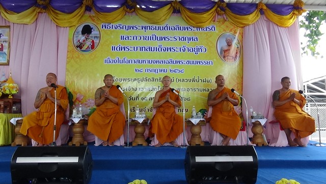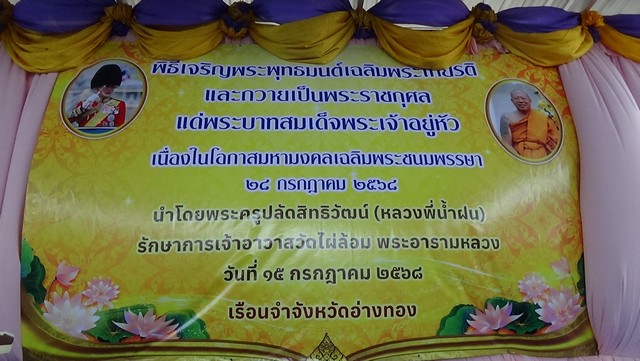 โดยมีนายชวนินทร์ วงศ์สถิตจิรกาล ผู้ว่าราชการจังหวัดอ่างทอง นายสมศักดิ์ ปริศนานันทกุล อดีตรัฐมนตรีว่าการกระทรวงเกษตรและสหกรณ์ นายธิตินัย พาติกบุตร ผบ.เรือนจำจังหวัดอ่างทอง พร้อมหัวหน้าส่วนร่วมสวดเจริญพระพุทธมนต์เฉลิมพระเกียรติฯ ด้วย